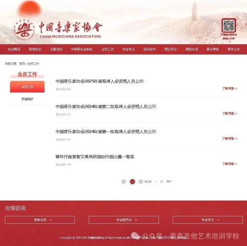 中国音乐家协会官网会员工作专栏刊发的“中国音乐家协会2025年度取得入会资格人员公示文件”主页