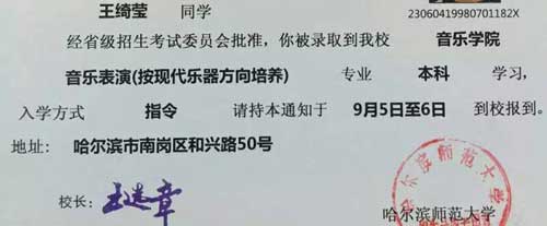 王绮莹哈尔滨师范大学音乐学院流行音乐系古典吉他专业录取通知书